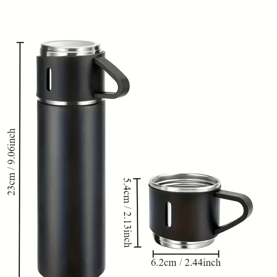 Introducing our Travel Insulated Vacuum Flask Set, perfect for those on the go. This set comes with three stainless steel cup, one large flask and vacuum insulation to keep your drinks hot or cold for hours. Holds up to 500ML (16.90oz) of fluids.